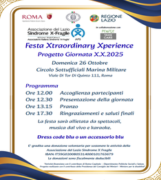 A conclusione del mese di sensibilizzazione sulla Sindrome X-Fragile, Domenica 26 Ottobre 2025 , si terrà a Roma , presso il Circolo Sottufficiali Marina Militare in Viale Tor di Quinto 111, l'evento "Festa Xtraordinary Xperience".